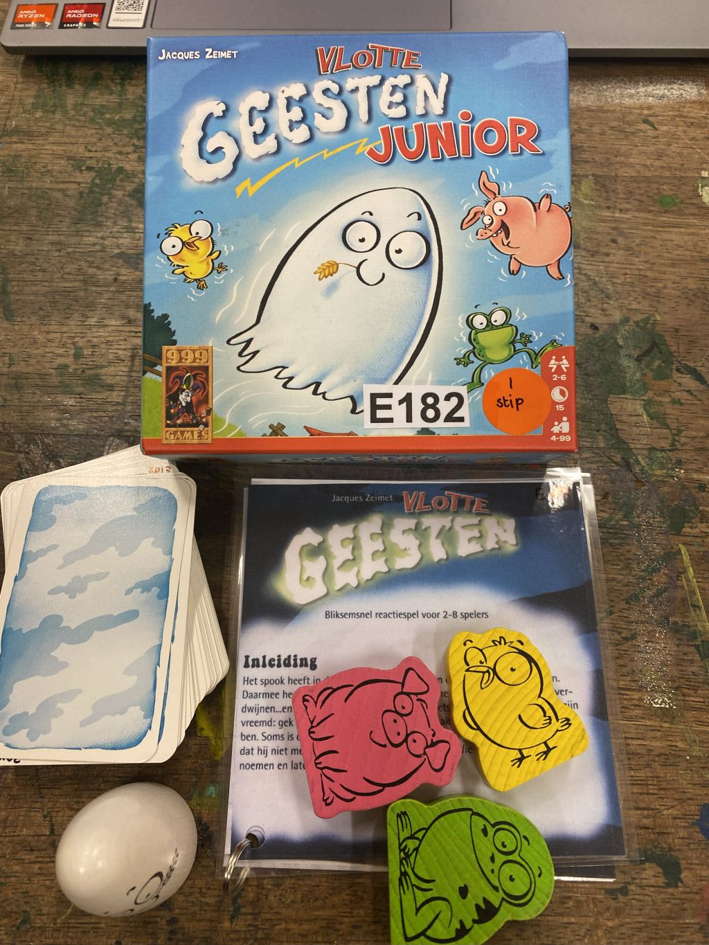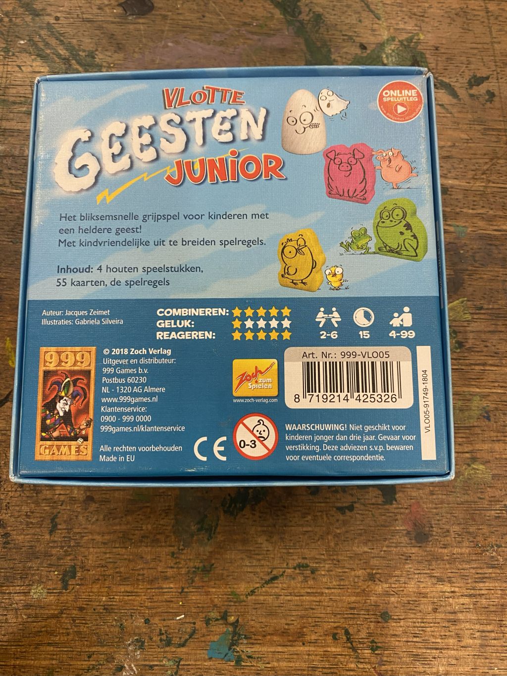 Bliksemsnel reactiespel voor jonge kinderen Vier voorwerpen staan in een kring op tafel, zodat iedereen er goed bij kan. Draai steeds de bovenste kaart om. Iedere speler probeert nu zo snel mogelijk de voorwerpen die op de kaart in de juiste kleur zijn afgebeeld van tafel te grijpen. Wie als eerste de juiste voorwerpen heeft gegrepen, krijgt als beloning een kaart. Wie aan het einde de meeste kaarten heeft, wint het spel. In het spel voor gevorderden zorgt een zwart spook ervoor dat je niets mag grijpen en levert een fout ook strafkaarten op! Vlotte Geesten Junior is de vereenvoudigde versie van het populaire Vlotte Geesten. Het spel is nu al geschikt voor kinderen vanaf 4 jaar en het spel voor gevorderden vanaf 6 jaar.